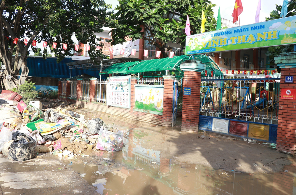 Trường mầm non Vĩnh Thạnh, phường Tây Nha Trang, tỉnh Khánh Hòa, vẫn còn ngổn ngang nước và rác thải ứ đọng trước cổng trường. |