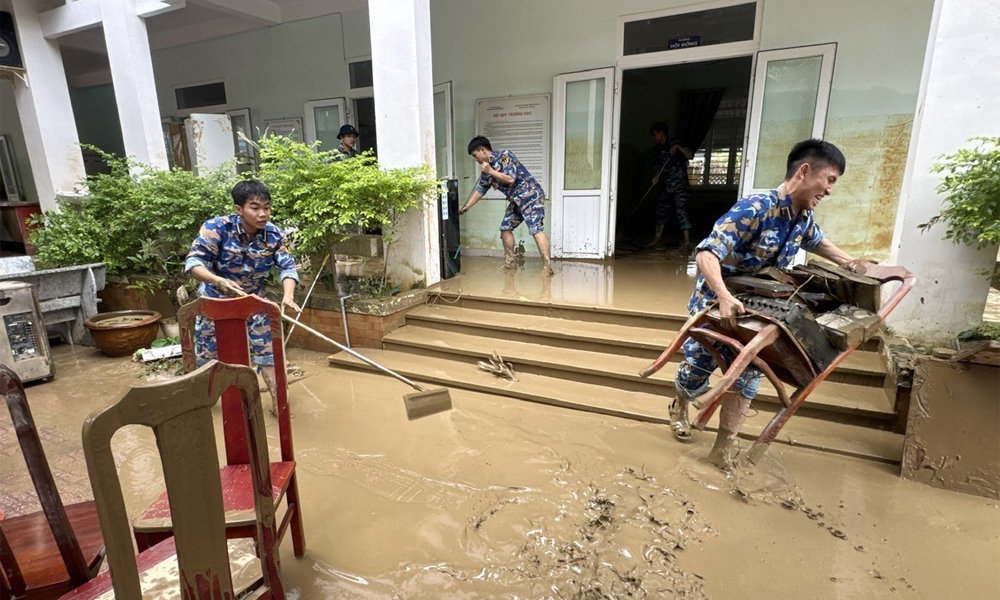 Sau khi nước rút, lực lượng quân đội đóng chân trên địa bàn tỉnh Khánh Hòa hỗ trợ khắc phục hậu quả do mưa lũ ở trường học. |
