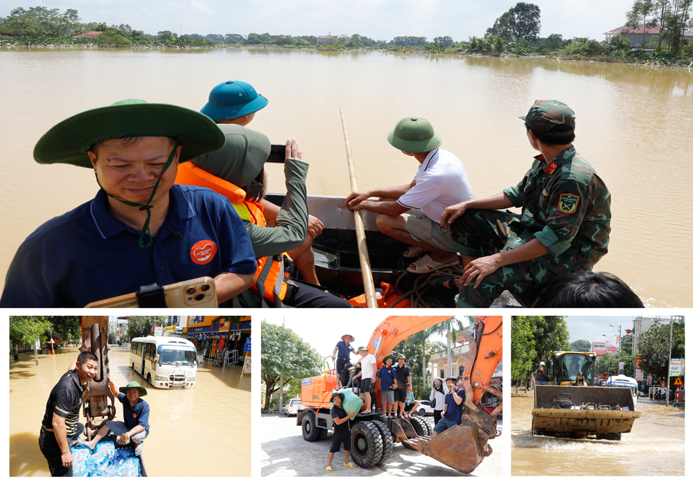 Đến dốc Hòa Bình, không khí khẩn trương, nhộn nhịp bao trùm cả khu phố mà trước đây chỉ thấy trên Đài Truyền hình Trung ương khi đưa tin ở những nơi “tâm bão” như: Hà Tĩnh, Nghệ An, Thanh Hóa… Hàng chục xe tải lớn nhỏ từ các tỉnh, thành phố như: Quảng Ninh, Thái Bình, Thanh Hóa… chở thực phẩm, nước uống, nhu yếu phẩm đến cứu trợ. Lực lượng vũ trang, người dân tình nguyện khuân vác hàng hóa lên xe quân đội để vận chuyển vào các thôn bị cô lập. Những chiếc máy xúc đất, máy nâng, máy gắp gỗ thường ngày chỉ làm việc ở những công trình, xưởng gỗ nay được huy động thành phương tiện hữu ích vận chuyển người, hàng hóa đến các hộ dân và “bến thuyền” bất đắc dĩ ngay trên các tuyến giao thông đường bộ, hoặc kéo xe ô tô chết máy khi qua những tuyến đường ngập nước.