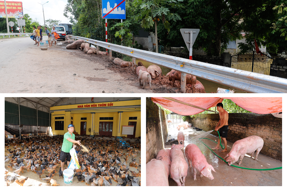 Anh Phạm Đình Đức, thôn Sỏi chia sẻ, gia đình đang nuôi 9 nghìn con gà thịt, mưa lũ đã cướp mất mấy trăm con. Anh phải lùa đàn gà vào sân Nhà văn hóa thôn Sỏi để nuôi tạm. Cạnh đó, hộ anh Nguyễn Văn Tuấn cũng bị lũ cuốn 10 con lợn nhưng trong chuồng vẫn còn gần trăm con.