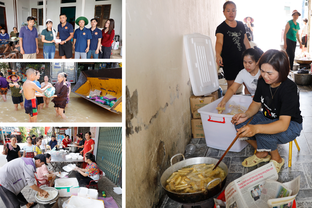 Cùng với hàng trăm cán bộ, chiến sĩ lực lượng vũ trang trong tỉnh và người dân địa phương đang vận chuyển hàng cứu trợ, các bếp ăn dã chiến dọc tuyến đường tỉnh 292 qua trung tâm xã Bố Hạ, các mẹ, các chị, cùng bao tình nguyện viên khác cũng luôn tay nấu nướng. Bà Nguyễn Thị Anh, thôn Hòa Bình nói, trong khi vẫn nhanh tay chia các suất cơm đóng hộp để kịp chuyển cho mọi người: “Toàn bộ lương thực, thực phẩm đều do bà con trong và ngoài xã hỗ trợ. Riêng tổ hậu cần do tôi đảm trách cung cấp 1,8 nghìn suất ăn/ngày. Cứ hộ nào cần thì ra lấy về, nếu không ra lấy được đội tình nguyện của xã sẽ mang vào tận nơi”.