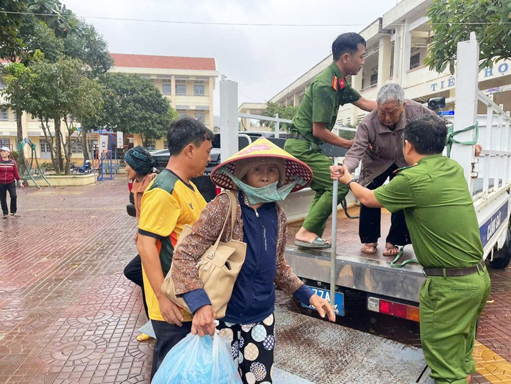 Lực lượng chức năng xã Hoài Nhơn, tỉnh Gia Lai đưa người dân đến địa điểm tránh bão. |
