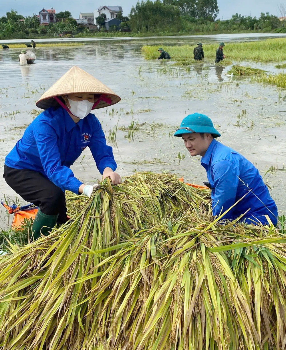 Quá trình thu hoạch lúa mùa trong mưa lũ gặp muôn vàn khó khăn. Nhiều thửa ruộng ngập sâu đến bụng, lúa chìm trong nước, bà con và cán bộ phải khom lưng vớt từng túm, cắt, bó gọn. Không có đủ vật tư hỗ trợ, các tình nguyện viên phải dùng bạt buộc túm lại hai đầu làm “thuyền” kéo lúa vào bờ. Lại có cán bộ đoàn viên bị côn trùng cắn sưng cả tay vẫn nhất quyết bám đồng, tình nguyện giúp bà con đến cùng.