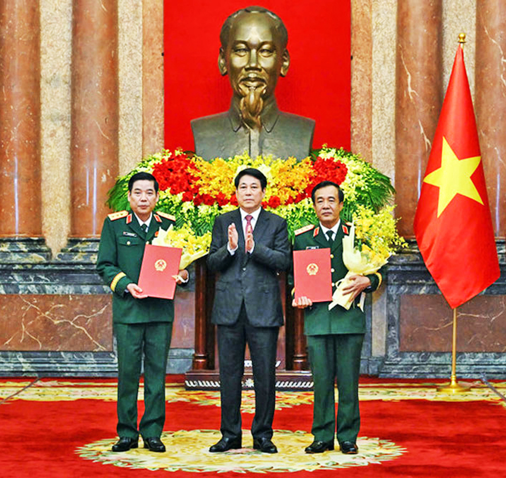 Trao quyết định và phát biểu ý kiến tại buổi lễ, thay mặt lãnh đạo Đảng, Nhà nước, Chủ tịch nước Lương Cường nhiệt liệt chúc mừng ba đồng chí được bổ nhiệm chức vụ và thăng quân hàm Đại tướng, Thượng tướng.