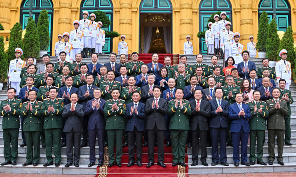 Đánh giá tình hình đó đang đặt ra những yêu cầu mới ngày càng cao đối với Lực lượng vũ trang trong nhiệm vụ xây dựng và bảo vệ Tổ quốc, Chủ tịch nước đề nghị các đồng chí vừa được bổ nhiệm, thăng quân hàm tiếp tục phát huy truyền thống vẻ vang của quân đội nhân dân Việt Nam anh hùng và phẩm chất “Bộ đội cụ Hồ” trong thời kỳ mới, tiếp tục giữ gìn đạo đức cách mạng, tuyệt đối trung thành với Đảng, Tổ quốc và nhân dân; đoàn kết, gắn bó máu thịt với cán bộ, chiến sĩ và nhân dân; tiếp tục học tập, tu dưỡng, rèn luyện để luôn xứng đáng là người lãnh đạo, chỉ huy tài năng, mẫu mực, nỗ lực phấn đấu, khắc phục khó khăn, thử thách, hoàn thành xuất sắc mọi nhiệm vụ mà Đảng, Nhà nước và nhân dân tin tưởng giao phó.