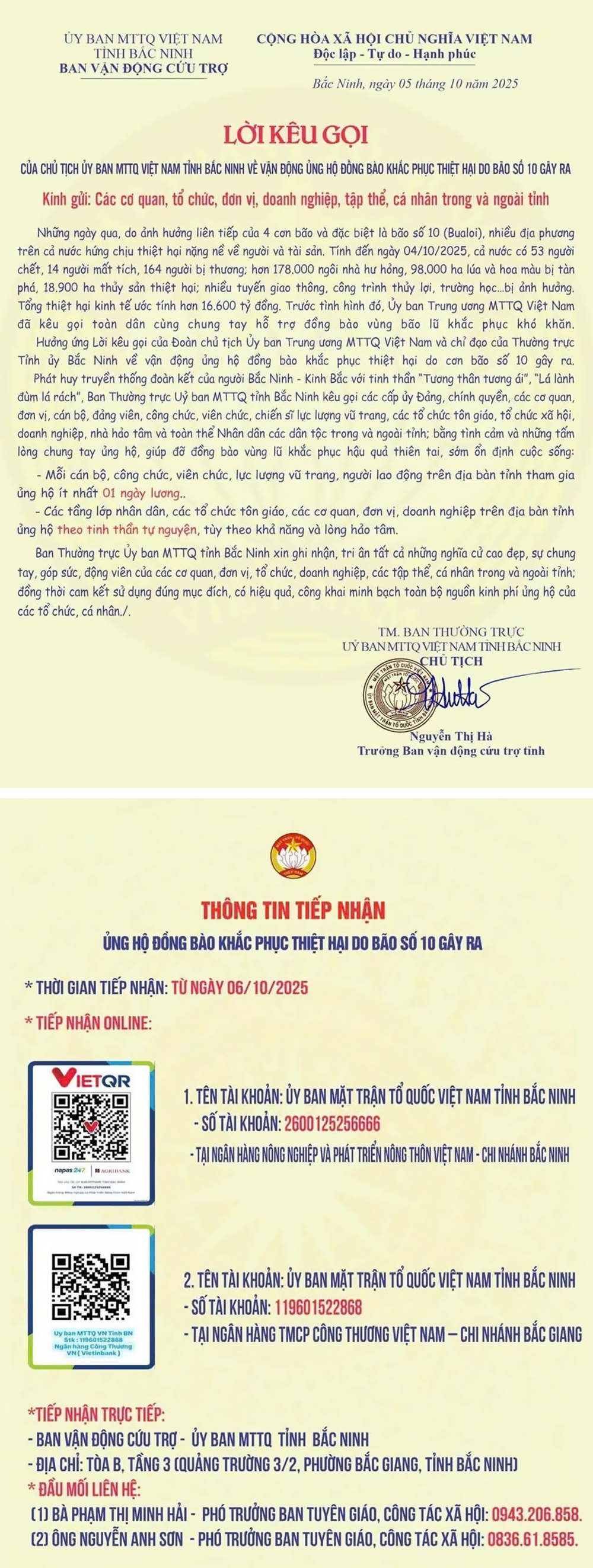 Những ngày qua, do ảnh hưởng liên tiếp của 4 cơn bão và đặc biệt là bão số 10 (Bualoi), nhiều địa phương trên cả nước hứng chịu thiệt hại nặng nề về người và tài sản. Tính đến ngày 4/10/2025, cả nước có 53 người chết, 14 người mất tích, 164 người bị thương, hơn 178.000 ngôi nhà hư hỏng, 98.000 ha lúa và hoa màu bị tàn phá, 18.900 ha thủy sản thiệt hại; nhiều tuyến giao thông, công trình thủy lợi, trường học… bị ảnh hưởng. Tổng thiệt hại kinh tế ước tính hơn 16.600 tỷ đồng, Trước tình hình đó, Ủy ban Trung ương MTTQ Việt Nam đã kêu gọi toàn dân cùng chung tay hỗ trợ đồng bào vùng bão lũ khắc phục khó khăn.