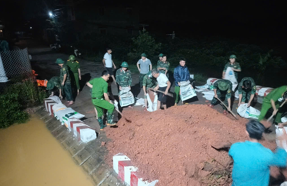 Cán bộ, chiến sĩ lực lượng vũ trang tỉnh gia cố đê tại thôn Cửa Sông (xã Phúc Hòa). |