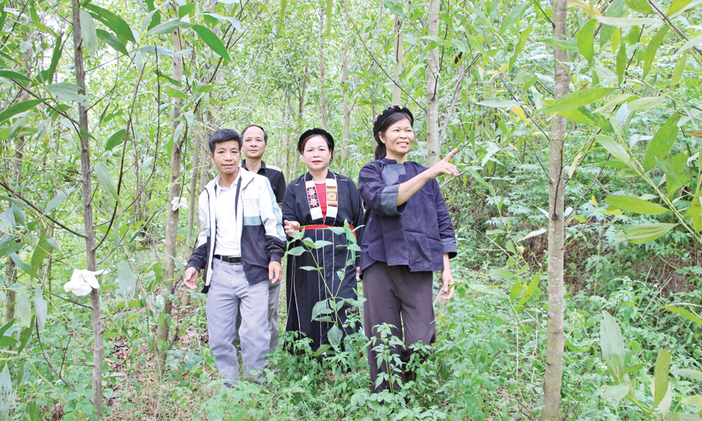 Chị Lộc Thị Xuân đưa người dân đi thăm mô hình trồng rừng kinh tế của gia đình. |