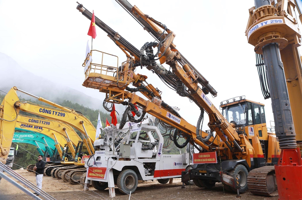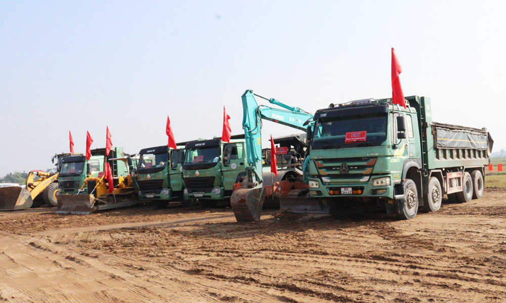 Nhà thầu tập trung phương tiện, máy móc đẩy nhanh tiến độ thi công. |