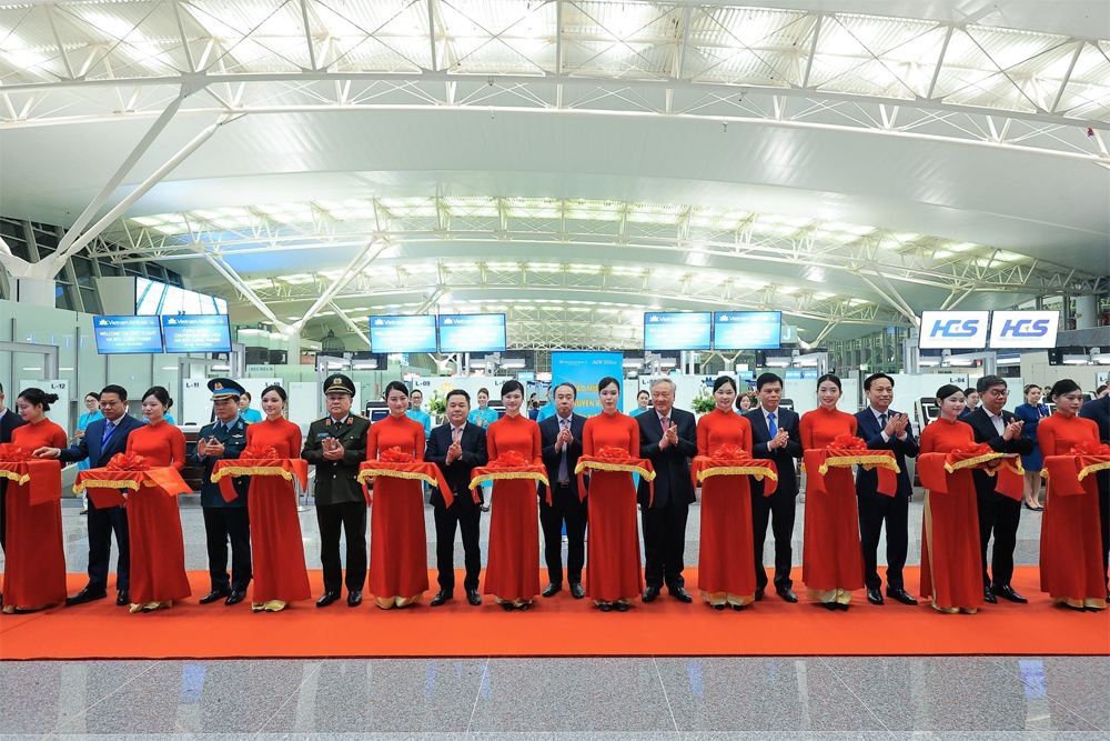 Phó Thủ tướng Thường trực Chính phủ Nguyễn Hòa Bình và các đại biểu thực hiện nghi thức cắt băng khánh thành Nhà ga hành khách T2 Cảng hàng không quốc tế Nội Bài. |
