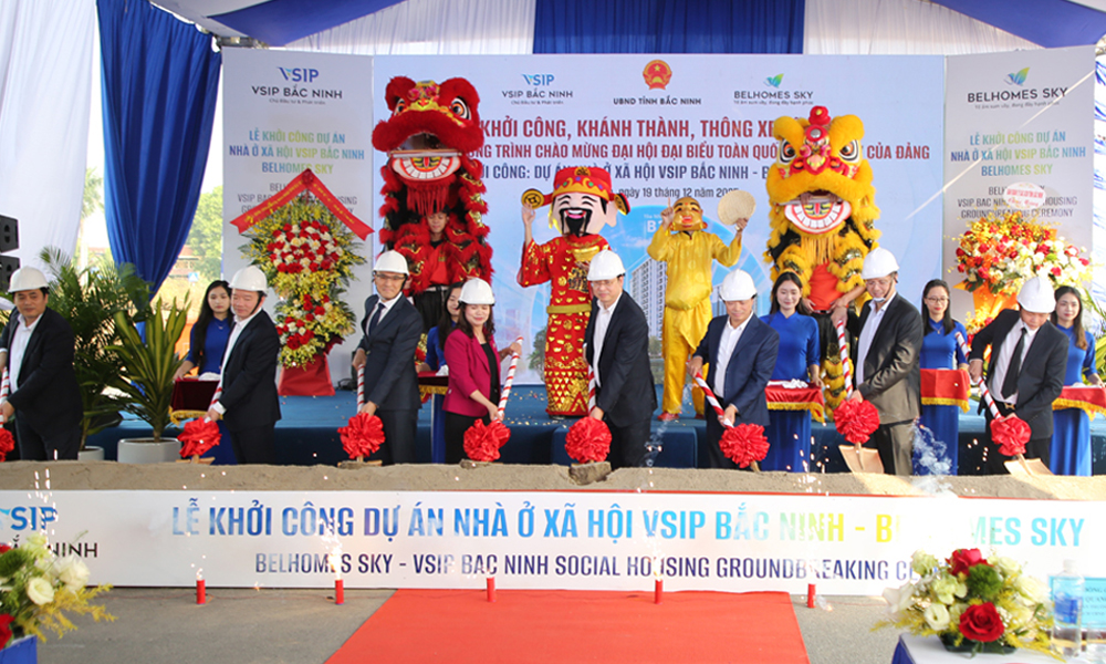 Các đồng chí lãnh đạo tỉnh Bắc Ninh thực hiện nghi thức động thổ khởi công dự án nhà ở xã hội BelHomes Sky. |