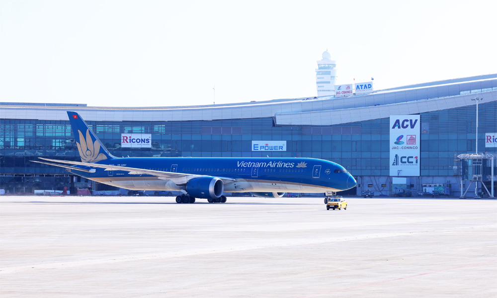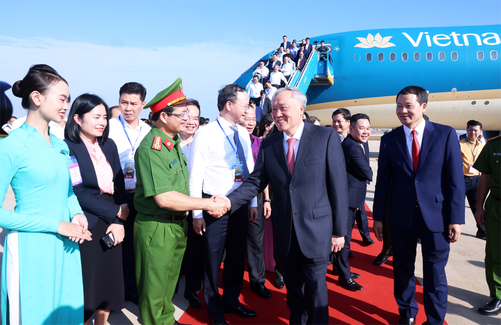 Phó Thủ tướng Thường trực Chính phủ Nguyễn Hòa Bình cùng các vị khách trên chuyến bay đặc biệt đầu tiên hạ cánh xuống sân bay quốc tế Long Thành, sáng 19/12. |