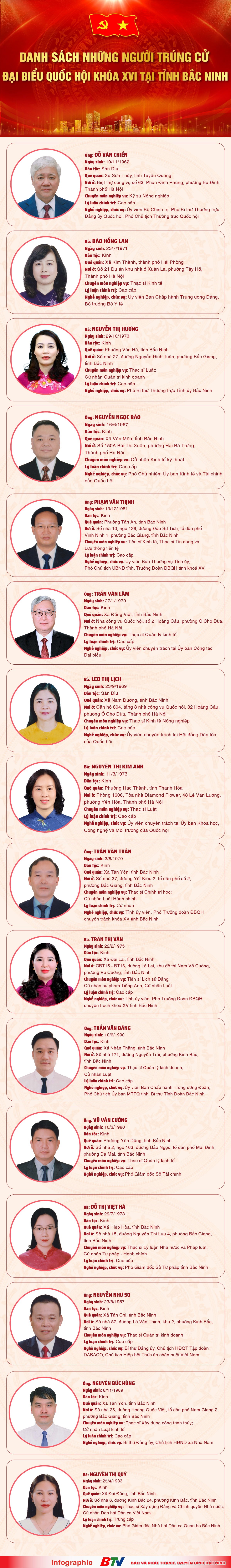 BẮC NINH - Chiều ngày 21/3, Hội đồng Bầu cử quốc gia công bố Nghị quyết số 232/NQ-HĐBCQG về kết quả bầu cử và công bố danh sách những người trúng cử đại biểu Quốc hội khóa XVI. Báo và Phát thanh, Truyền hình Bắc Ninh trân trọng đăng danh sách những người trúng cử đại biểu Quốc hội khóa XVI tại tỉnh Bắc Ninh.