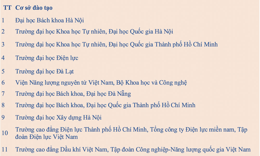Có 11 cơ sở đào tạo gồm các đại học, viện, trường đại học, trường cao đẳng thực hiện nhiệm vụ đào tạo nguồn nhân lực phục vụ phát triển điện hạt nhân đến năm 2035.