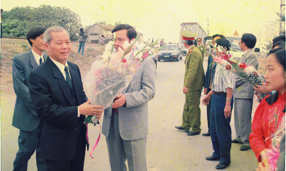 Đồng chí Ngô Đình Loan chia tay lãnh đạo tỉnh Bắc Giang tại đầu cầu Thị Cầu trước ngày tái lập hai tỉnh Bắc Giang, Bắc Ninh (ngày 31/12/1996). Ảnh: Việt Hưng. |