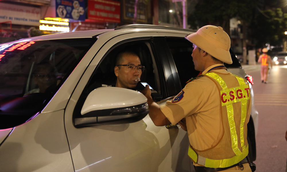 Lực lượng cảnh sát giao thông kiểm tra nồng độ cồn đối với lái xe ô tô trong tối 18/10. |