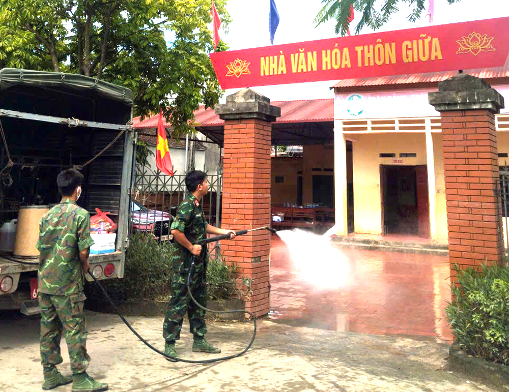 Cán bộ, chiến sĩ phun khử khuẩn tại nhà văn hóa thôn Giữa, xã Tiên Lục. |