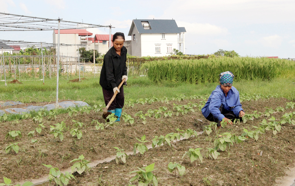 Người dân thôn Minh Sơn, xã Trung Sơn (thị xã Việt Yên) chăm sóc đậu tương. |