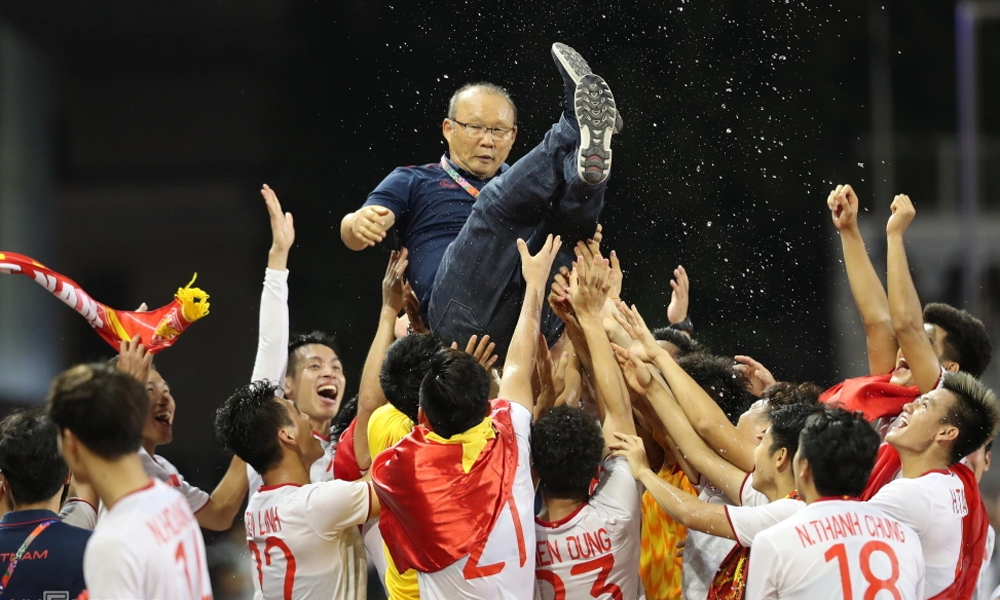 HLV Park Hang-seo được cầu thủ tung hô khi giúp U23 Việt Nam thắng U23 Indonsia 3-0 ở chung kết SEA Games 30 năm 2019 tại Philippines. |