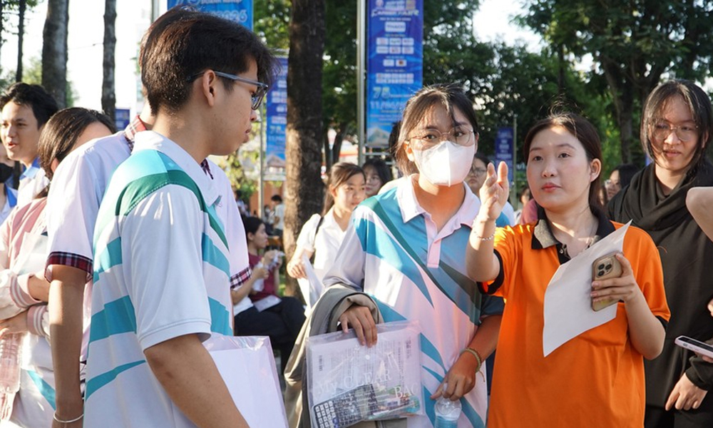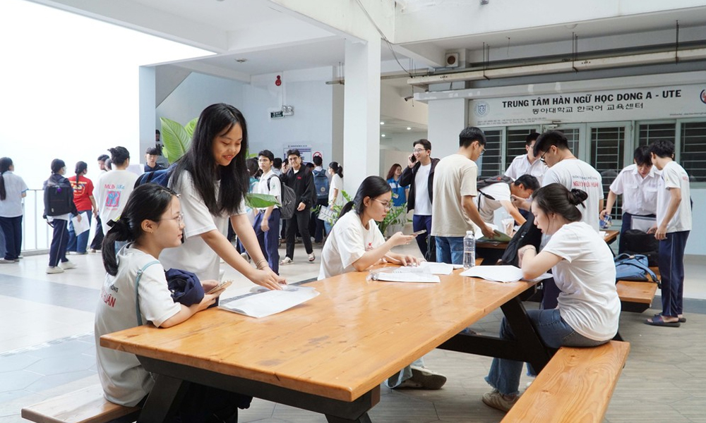 Tình nguyện viên hướng dẫn thí sinh đến phòng thi tại điểm thi Trường Đại học Công nghệ Kỹ thuật Thành phố Hồ Chí Minh. |