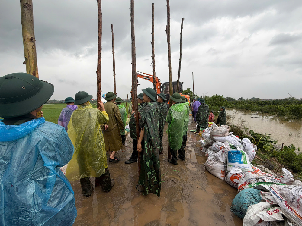 Các đồng chí lãnh đạo Đảng ủy, UBND phường Yên Dũng trực tiếp có mặt tại hiện trường chỉ đạo công tác xử lý sự cố, bảo đảm an toàn tuyến đê. Do mặt bằng chật hẹp, không thể huy động máy móc lớn, lực lượng tại chỗ tập trung gia cố bằng biện pháp thủ công kết hợp cơ giới nhỏ.