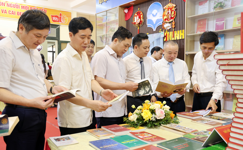 Tại đây, các đại biểu cắt băng khai mạc và tham quan không gian trưng bày sách. Hàng nghìn đầu sách thuộc nhiều chủ đề như chính trị, quân sự, ca ngợi Đảng, Bác Hồ, quê hương, đất nước… được giới thiệu, phục vụ bạn đọc miễn phí. Không gian trưng bày gây ấn tượng với cách sắp xếp sách thành các mô hình độc đáo: Chùa Vĩnh Nghiêm, nón quai thao…