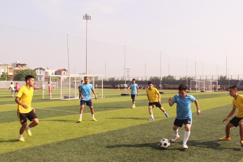 Một pha bóng trong trận đấu giữa đội Công đoàn Công ty TNHH Seojin Việt Nam và đội Công đoàn Công ty TNHH Newwing. |