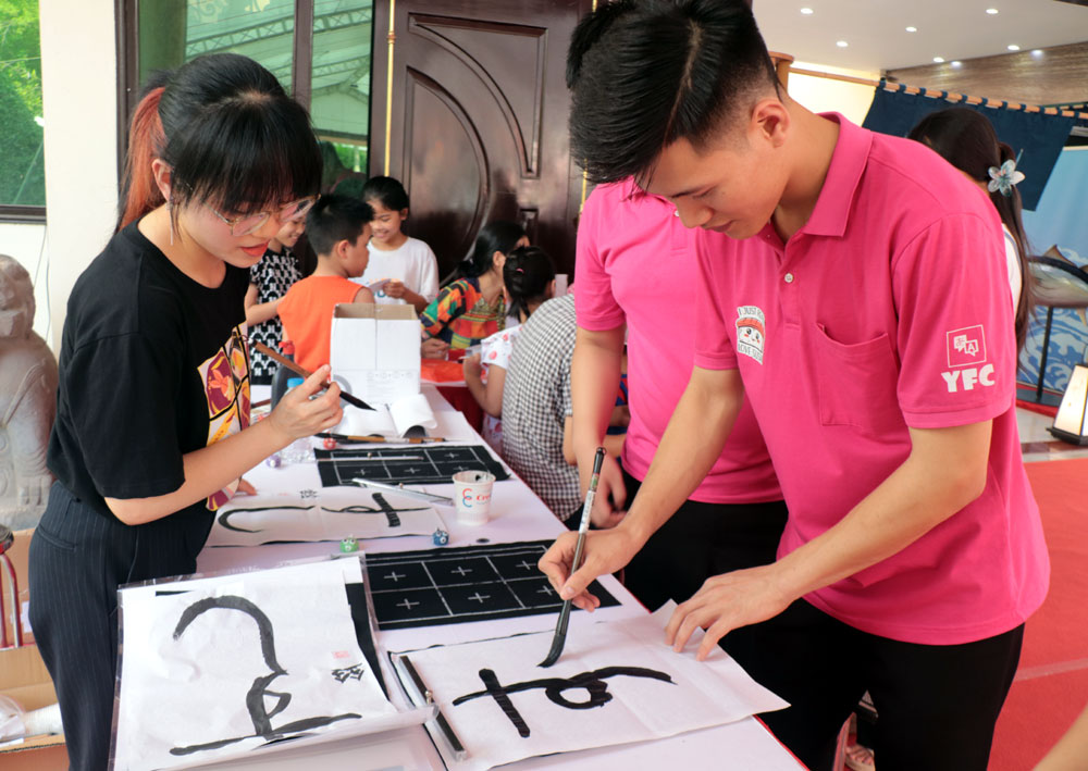 Khách tham quan trải nghiệm viết chữ Hán. |