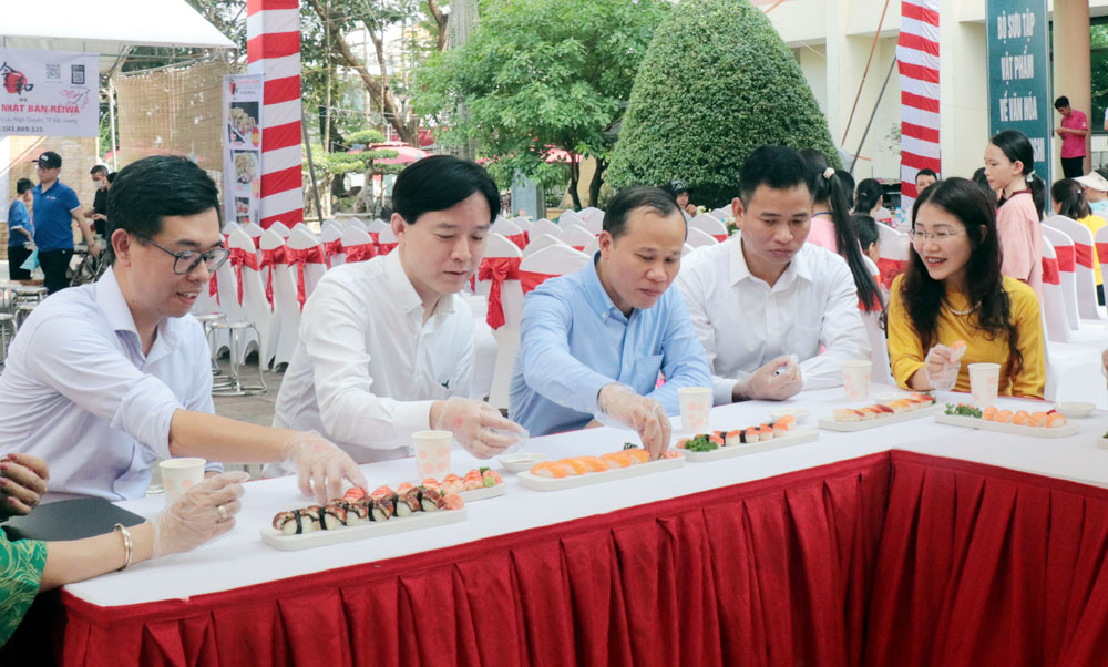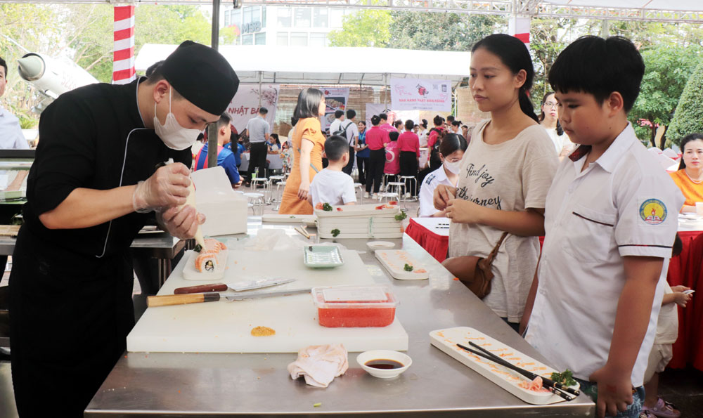 Tại lễ khai mạc, Ban tổ chức mô phỏng hoạt động tiệm sushi ở Nhật Bản giúp đại biểu và khách tham quan được chiêm ngưỡng nghệ thuật chế biến, thưởng thức sushi, uống trà xanh Ryokucha. Các món ăn này do đầu bếp một số nhà hàng ẩm thực Nhật Bản tại TP Bắc Giang chế biến.