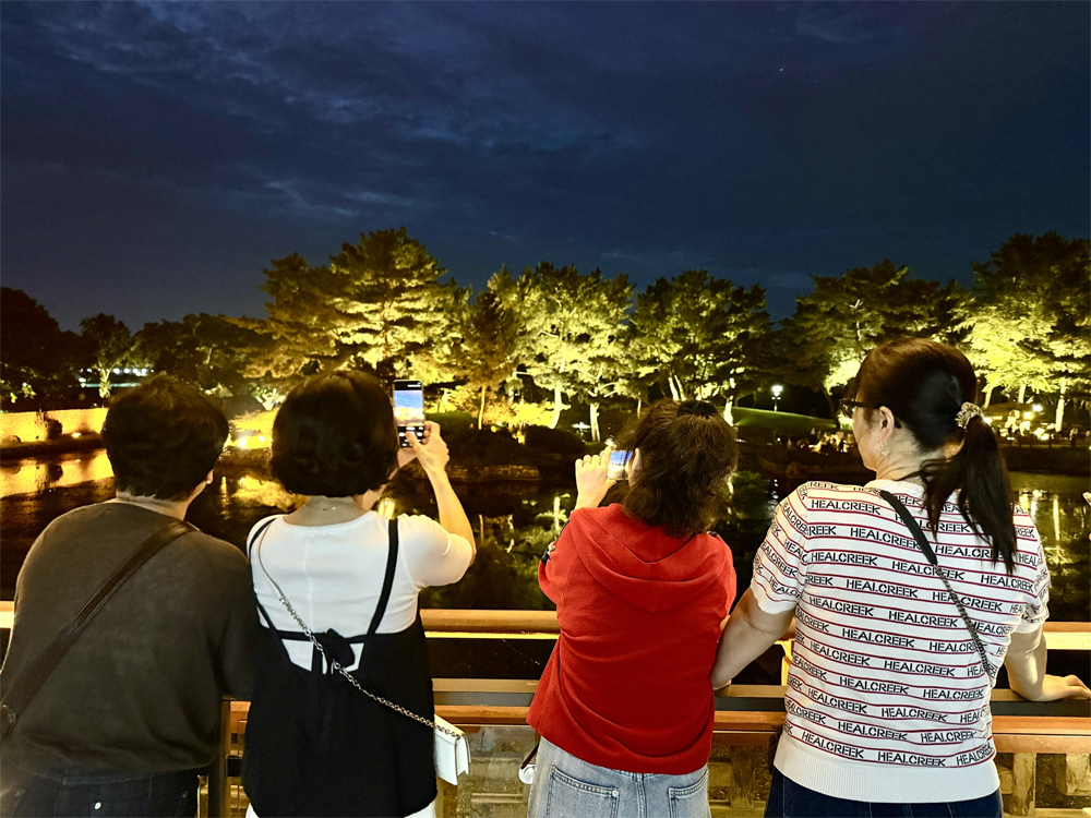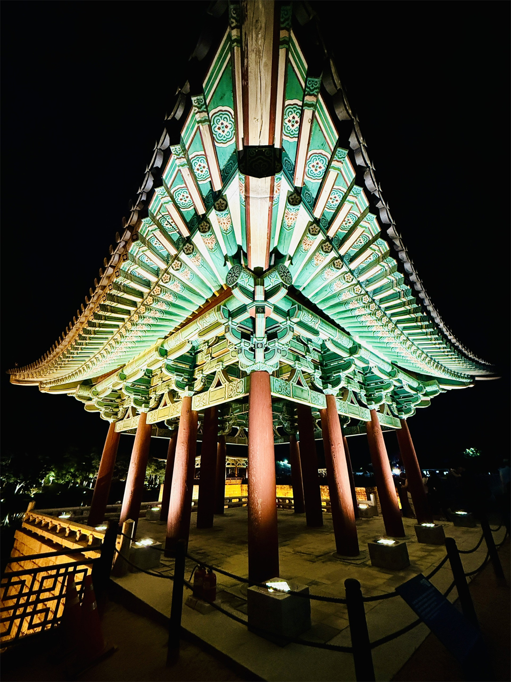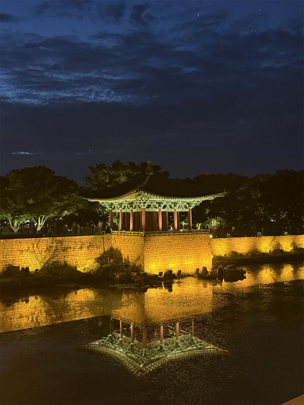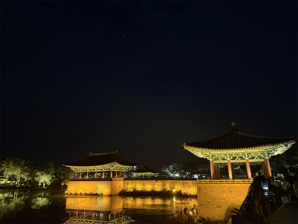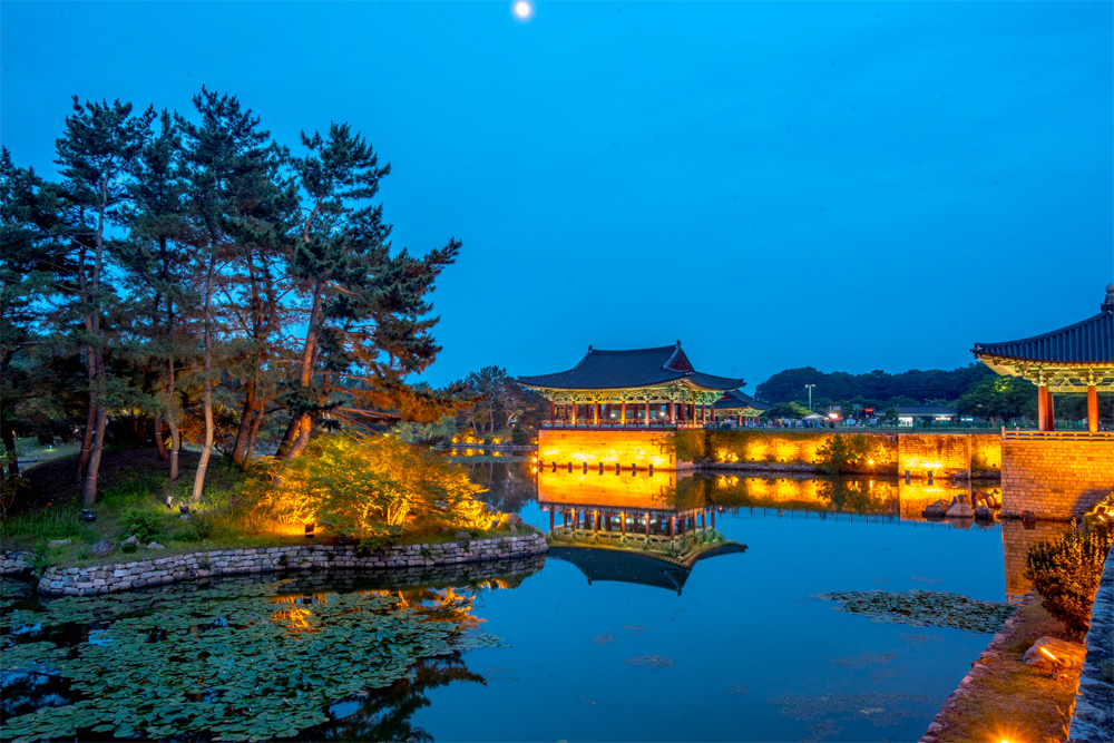 Cung điện Donggung và hồ Wolji (trước đây gọi là Anapji) là địa điểm du lịch nổi tiếng bậc nhất Gyeongju. Khi đêm xuống, ánh đèn phản chiếu trên mặt hồ phẳng lặng, soi bóng những mái ngói cong và hàng cây cổ thụ, tạo nên khung cảnh lung linh như trong tranh.
