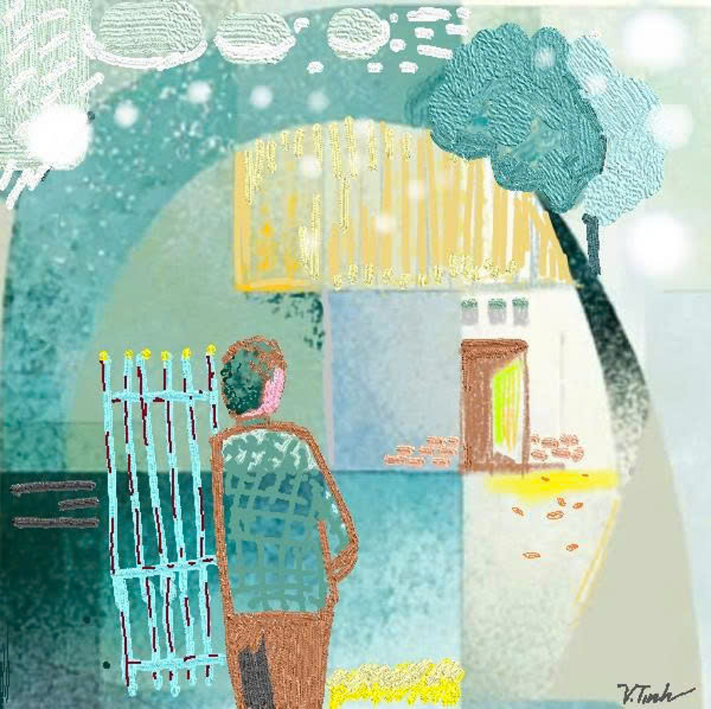 Khải im lặng. Trong đầu Khải hiện ra hình ảnh má ngồi trước hiên, vá áo, thỉnh thoảng ngẩng lên nhìn ra cổng.