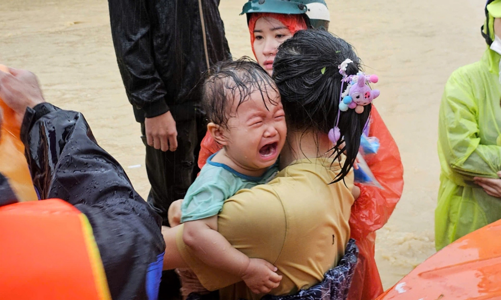 Em nhỏ bật khóc khi được cứu hộ qua vùng ngập trên đường 23 tháng 10, phường Tây Nha Trang, ngày 20/11. |