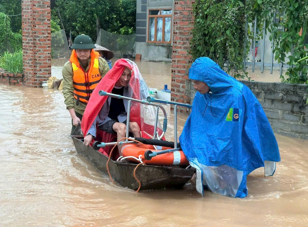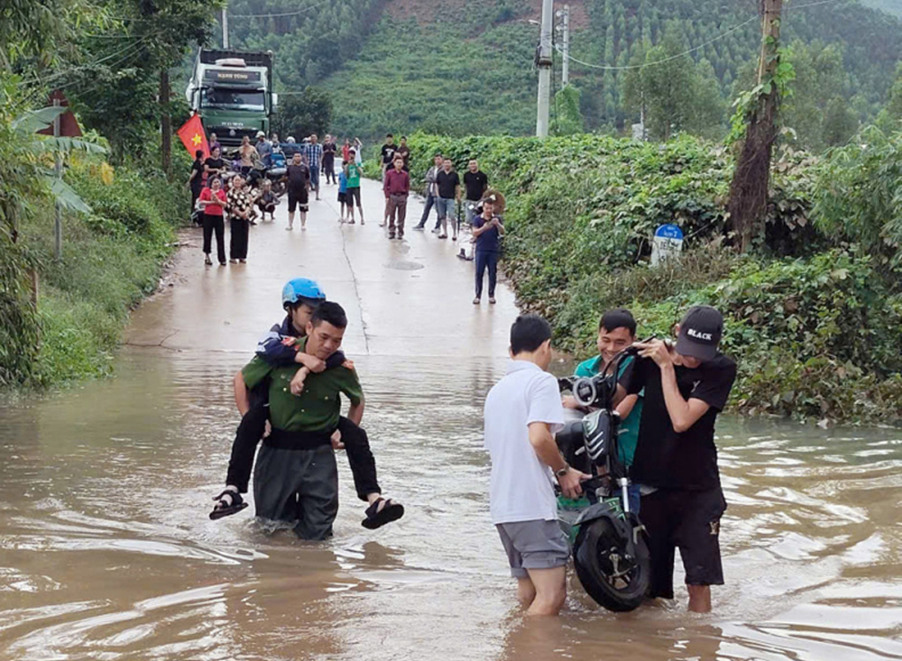 Lực lượng Cảnh sát cứu hộ, cứu nạn hỗ trợ người dân xã Tiên Lục rời khu vực nguy hiểm. |