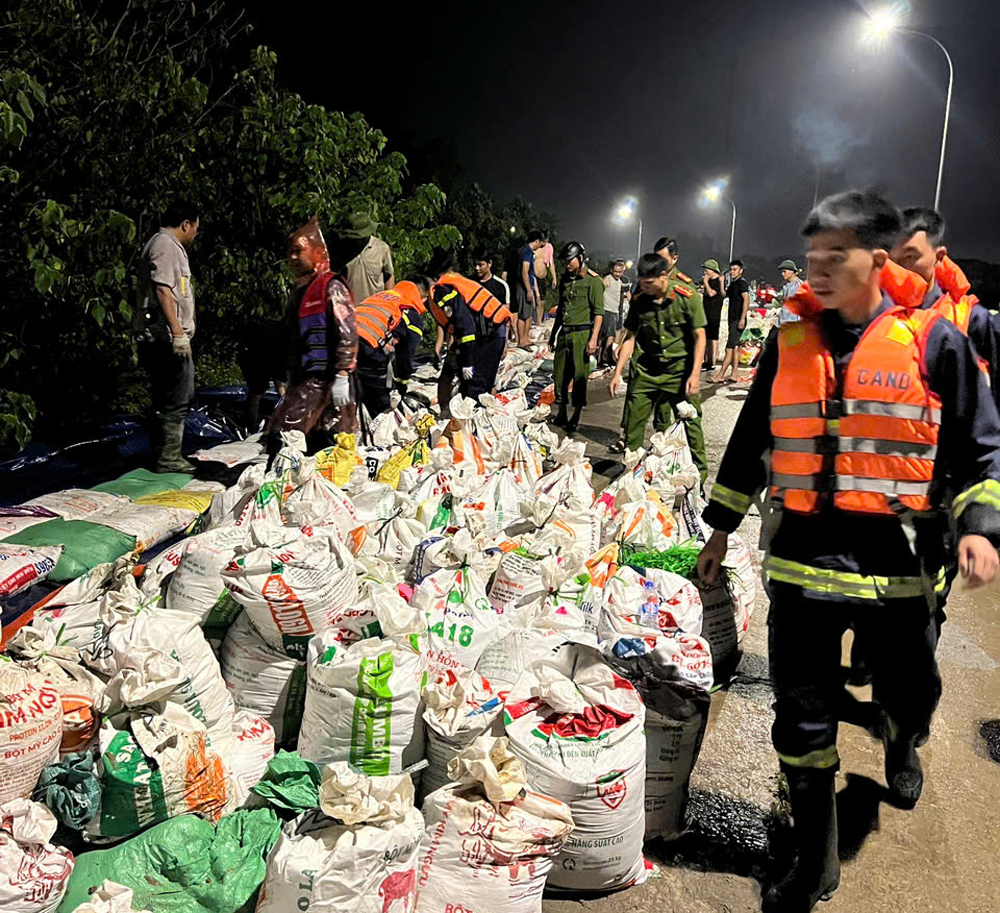 Cán bộ, chiến sĩ công an khu vực Đại Phúc phối hợp cùng Công an phường Kinh Bắc hỗ trợ người dân gia cố những đoạn đê xung yếu. |