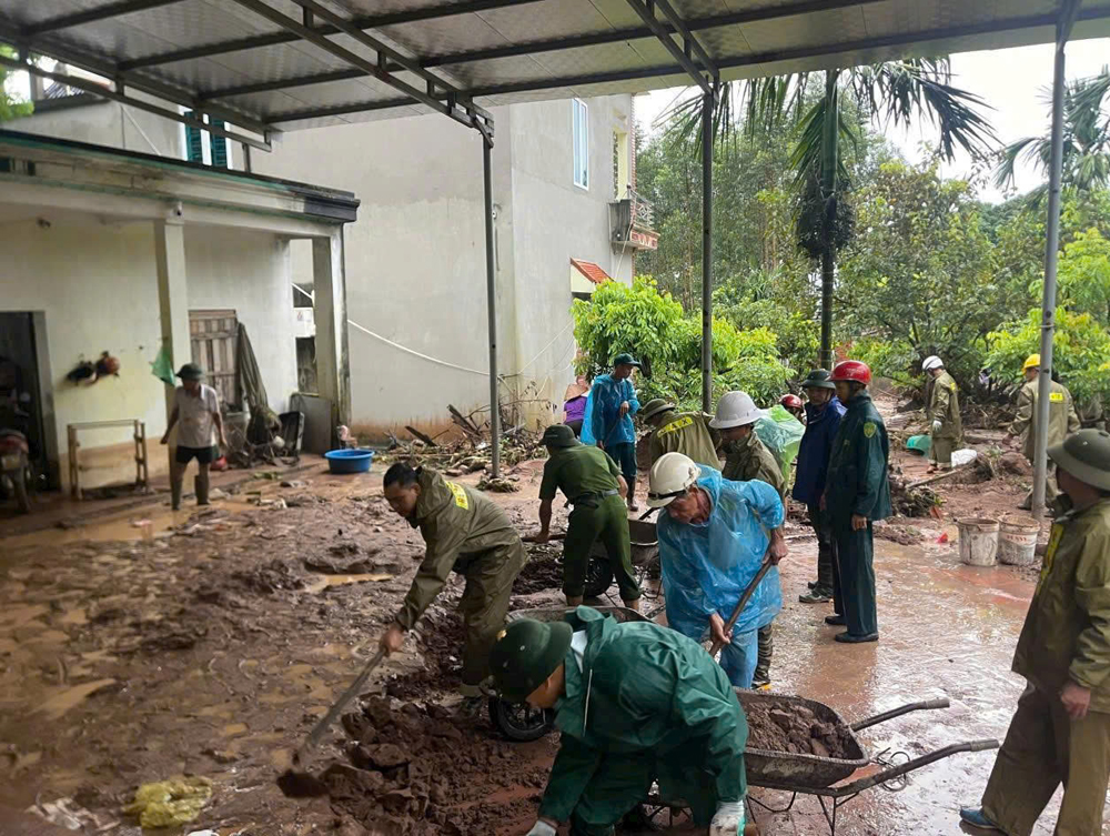 Công an xã Bắc Lũng huy động lực lượng hỗ trợ Nhân dân khắc phục hậu quả do mưa bão gây ra. |