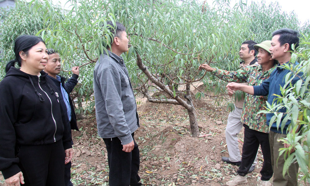 Cán bộ Phòng Kinh tế xã Lục Nam và thôn Vườn thăm mô hình trồng đào của người dân. |