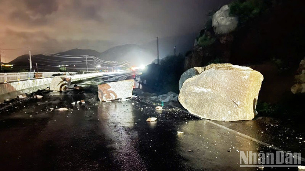 Đá từ sườn núi Khánh Hòa (tỉnh Lâm Đồng) sạt lở xuống đường Quốc lộ tối 19/11. |