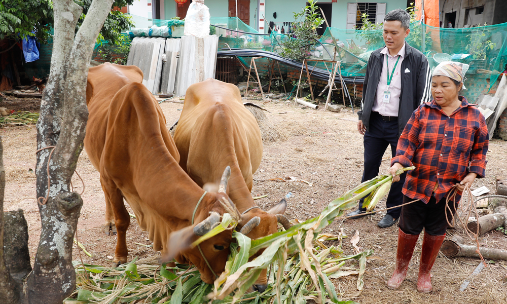 Cán bộ Phòng Giao dịch Ngân hàng Chính sách xã hội Tân Yên thăm mô hình chăn nuôi gia súc của hộ bà Nguyễn Thị Ngà. |