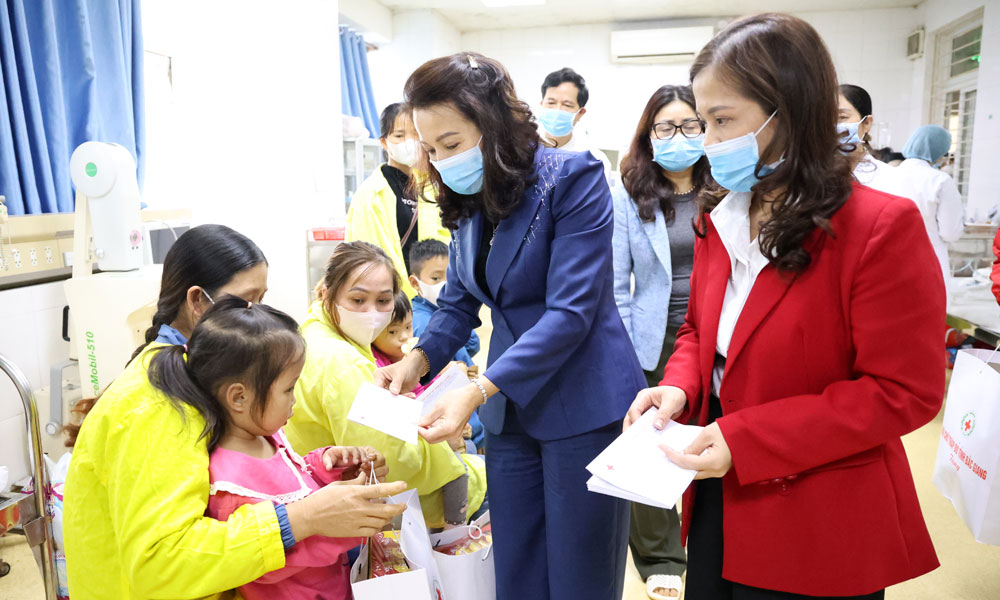 Đồng chí Nguyễn Thị Hương và lãnh đạo Hội Chữ thập đỏ tỉnh tặng quà Tết cho bệnh nhân hoàn cảnh khó khăn điều trị tại Bệnh viện Sản - Nhi Bắc Giang. |