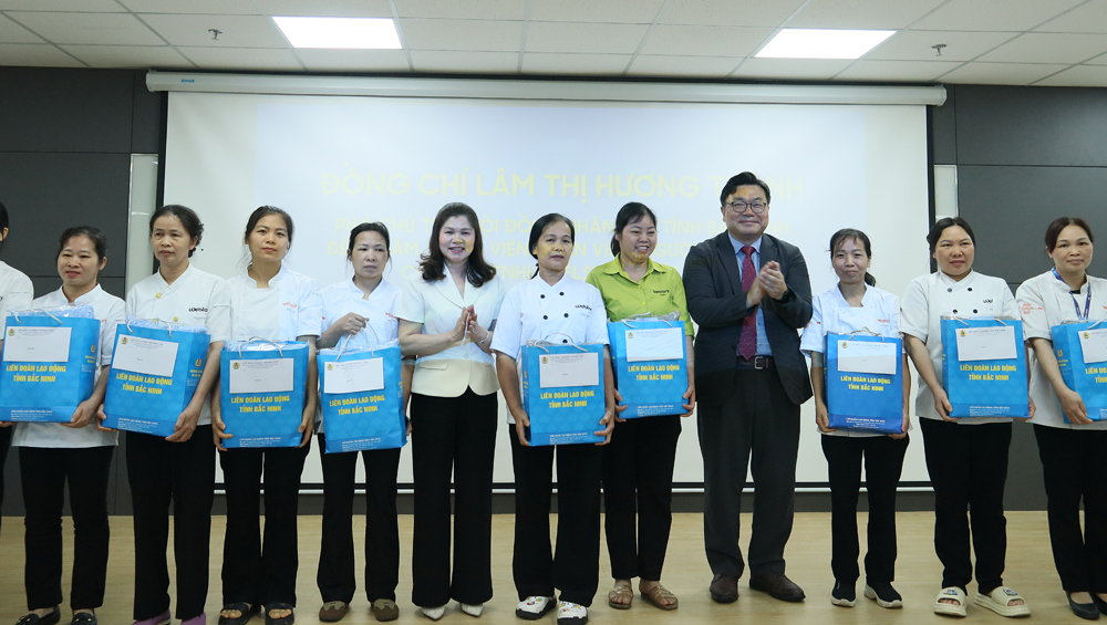 Đồng chí Lâm Thị Hương Thành và lãnh đạo Công ty Trách nhiệm hữu hạn Welstory Việt Nam trao quà cho người lao động. |