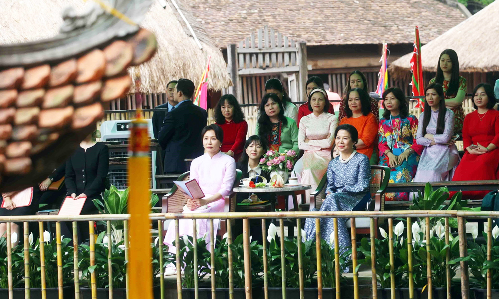 Trong không khí gần gũi và thân tình, tại Tòa Trống đồng, hai Phu nhân đã cùng nghe giới thiệu khái quát về cộng đồng 54 dân tộc Việt Nam, những nét đẹp đặc sắc của văn hóa các dân tộc anh em trên khắp ba miền bắc-trung-nam.
