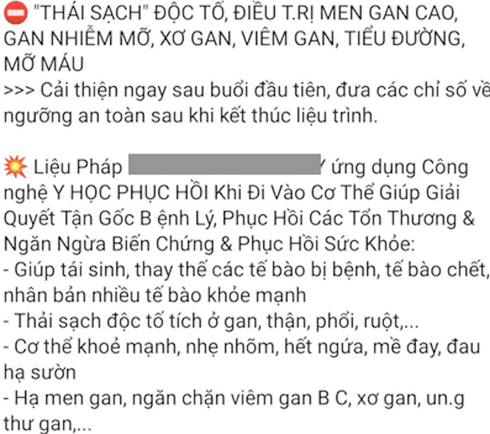 Tương tự, trên Facebook Trung tâm Gan thận một bệnh viện tư tại Hà Nội cũng quảng cáo liệu trình thải độc - phục hồi gan chuyên sâu: “Đào thải độc tố tích tụ lâu ngày trong gan; phục hồi chức năng gan - ổn định men gan; ngăn ngừa biến chứng xơ gan, viêm gan mạn, ung thư gan”.