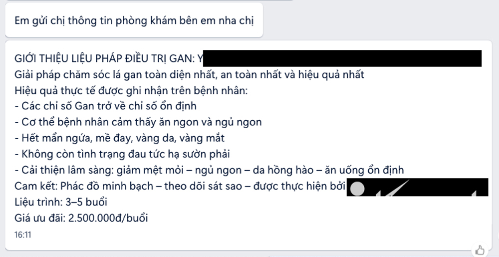 “Nếu các chỉ số gần như ổn định thì chỉ cần truyền khoảng 2-3 buổi. Các chỉ số cần phải lưu ý thì sẽ truyền khoảng 5 buổi, giá 3 triệu đồng/buổi. Thời gian mỗi buổi kéo dài 2-3 giờ sẽ điều trị triệt để tận gốc các bệnh lý nền đồng thời tái tạo cho gan lớp màng bảo vệ”, nữ nhân viên chăm sóc khách hàng hướng dẫn.