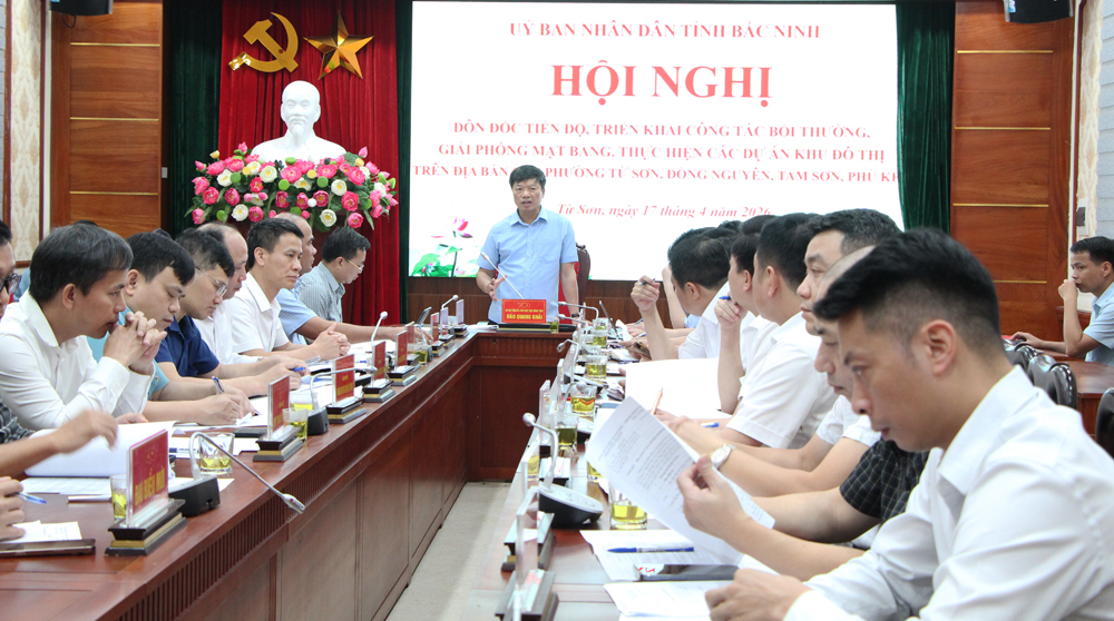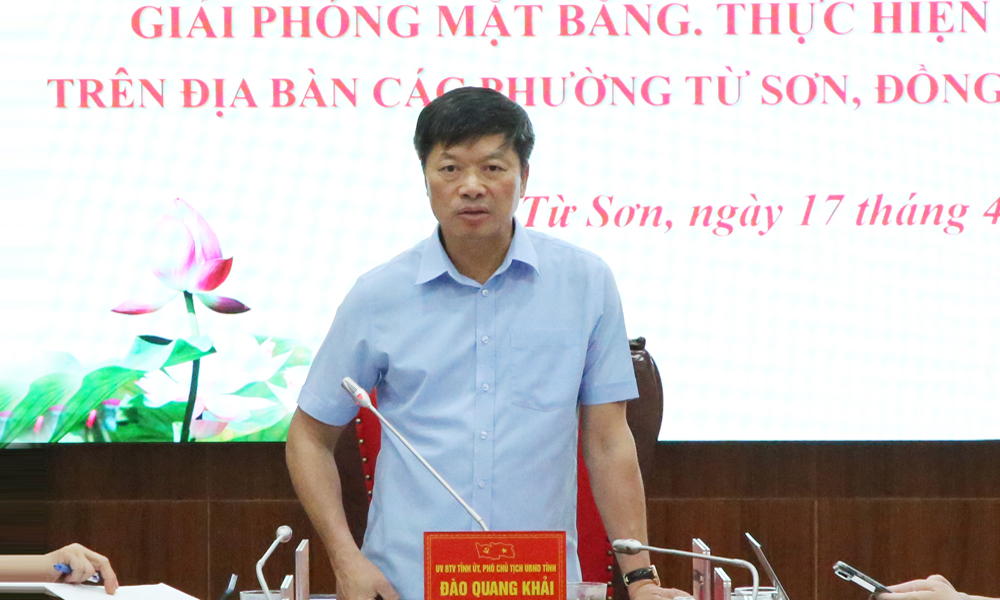 BẮC NINH - Chiều 17/4, đồng chí Đào Quang Khải, Ủy viên Ban Thường vụ Tỉnh ủy, Phó Chủ tịch UBND tỉnh chủ trì buổi làm việc về kiểm điểm tiến độ triển khai công tác giải phóng mặt bằng thực hiện các dự án khu đô thị trên địa bàn các phường Từ Sơn, Phù Khê, Đồng Nguyên, Tam Sơn.