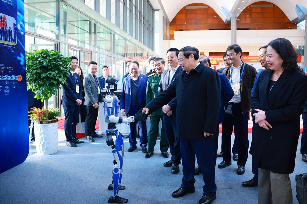 Thủ tướng Phạm Minh Chính kiểm tra khu trung bày các sản phẩm khoa học công nghệ. |