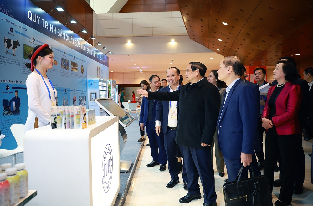 Thủ tướng Phạm Minh Chính kiểm tra khu trưng bày các sản phẩm tiêu biểu. |