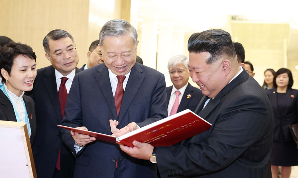 Sau khi kết thúc hội đàm, Tổng Bí thư Tô Lâm trao tặng Tổng Bí thư, Chủ tịch Quốc vụ Triều Tiên Kim Jong Un cuốn sách ảnh "Thắm tình hữu nghị Việt Nam - Triều Tiên". (Ảnh: TTXVN) |