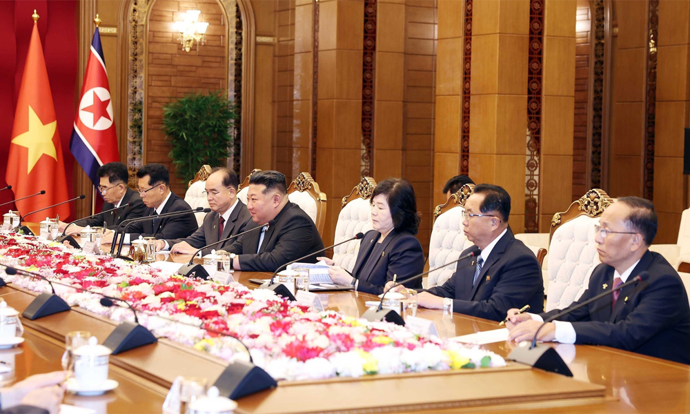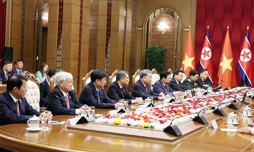 Tổng Bí thư Tô Lâm và Đoàn cấp cao Việt Nam tại cuộc hội đàm với Tổng Bí thư, Chủ tịch Quốc vụ Triều Tiên Kim Jong Un. (Ảnh: TTXVN) |
