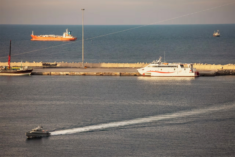 Một tàu cảnh sát tuần tra cảng khi các tàu chở dầu và tàu cao tốc neo đậu tại khu neo đậu Muscat, gần eo biển Hormuz ở Muscat, Oman, ngày 31/3. |